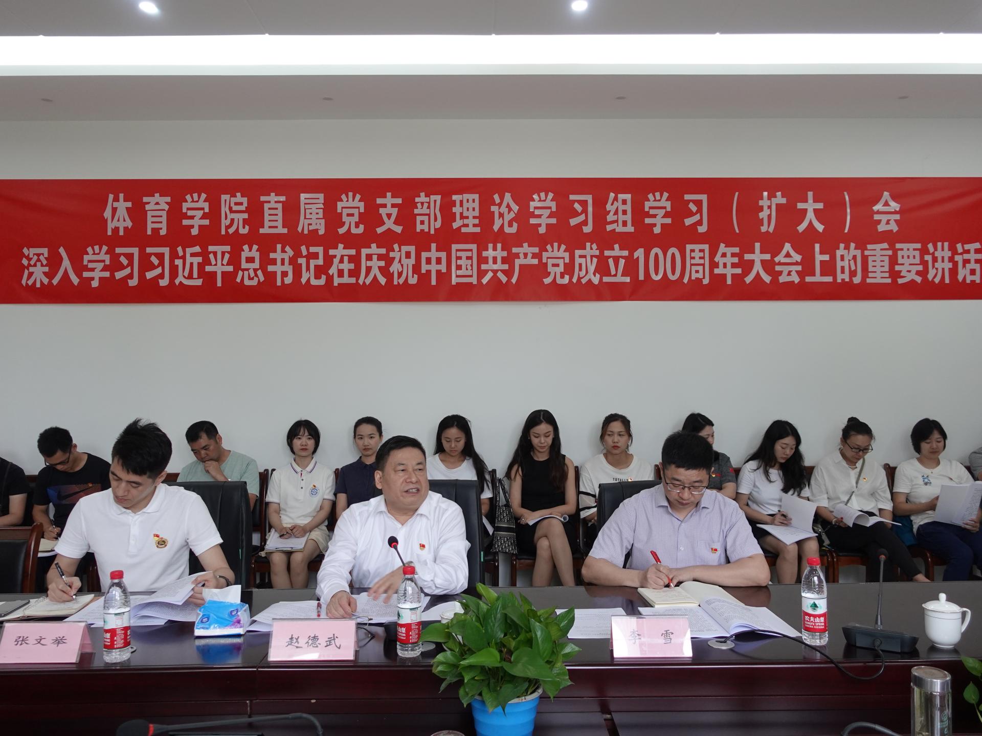 7月8日上午,爱体育(中国)体育官方网站召开专题学习会,深入学习习近平总书记在庆祝中国共产党成立100周年大会上的重要讲话。学校党委书记赵德武、党史学习教育第八指导组组长李雪、党委办公室副主任张文举、爱体育(中国)体育官方网站教工党员、二级部门负责人、入党积极分子参加会议。会议由直属党支部书记杨远波主持。