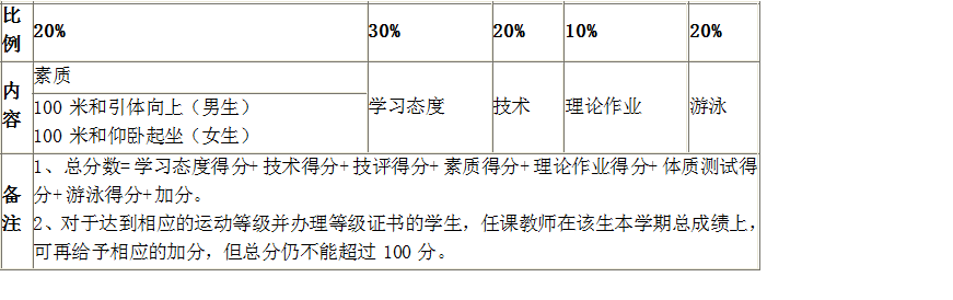 备注 1、总分数=学习态度得分+技术得分+技评得分+素质得分+理论作业得分+体质测试得分+游泳得分+加分。