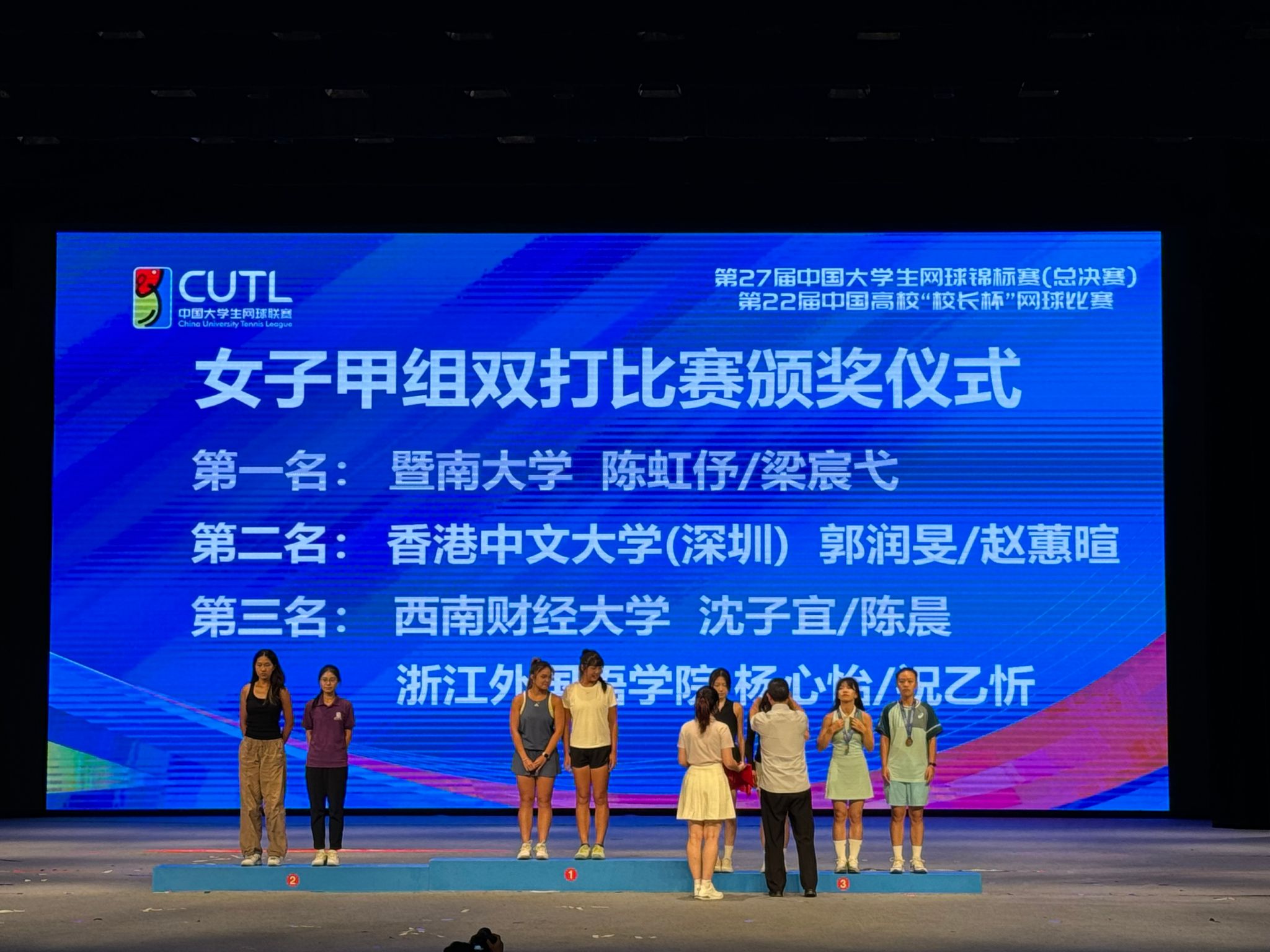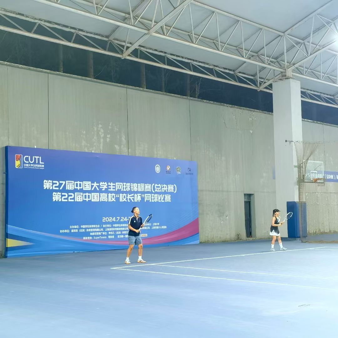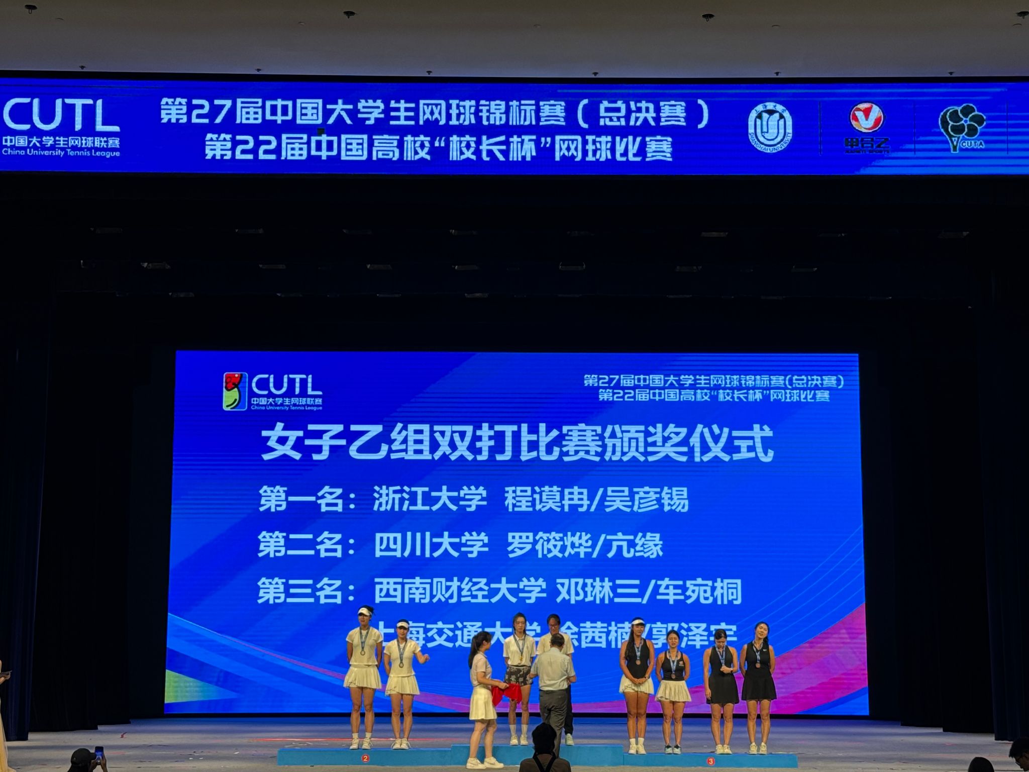7月22日-8月1日,第27届中国大学生网球锦标赛(总决赛)在上海大学(宝山校区)举行。中国大学生网球锦标赛是我国大学生层面最顶级的网球赛事,经过八大分区赛的激烈角逐,在本届中国大学生网球锦标赛(总决赛)中,共有来自全国132所高校的915名同学成功晋级总决赛。参赛规模创历史新高!爱体育(中国)体育官方网站网球队在前期分区赛上表现突出,成功晋级总决赛,11名运动员代表学校参赛,孙巨杉、施泓宇、孔星宇担任教练。经过八天的激烈角逐,西财健儿们在强手如林的赛场上顽强拼搏,团结奋进,获得女子普通高校甲组双打季军和女子高水平乙组双打季军的好成绩,充分展现了西财学子的精神风貌和青春风采,为即将到来的西财百年华诞献礼!