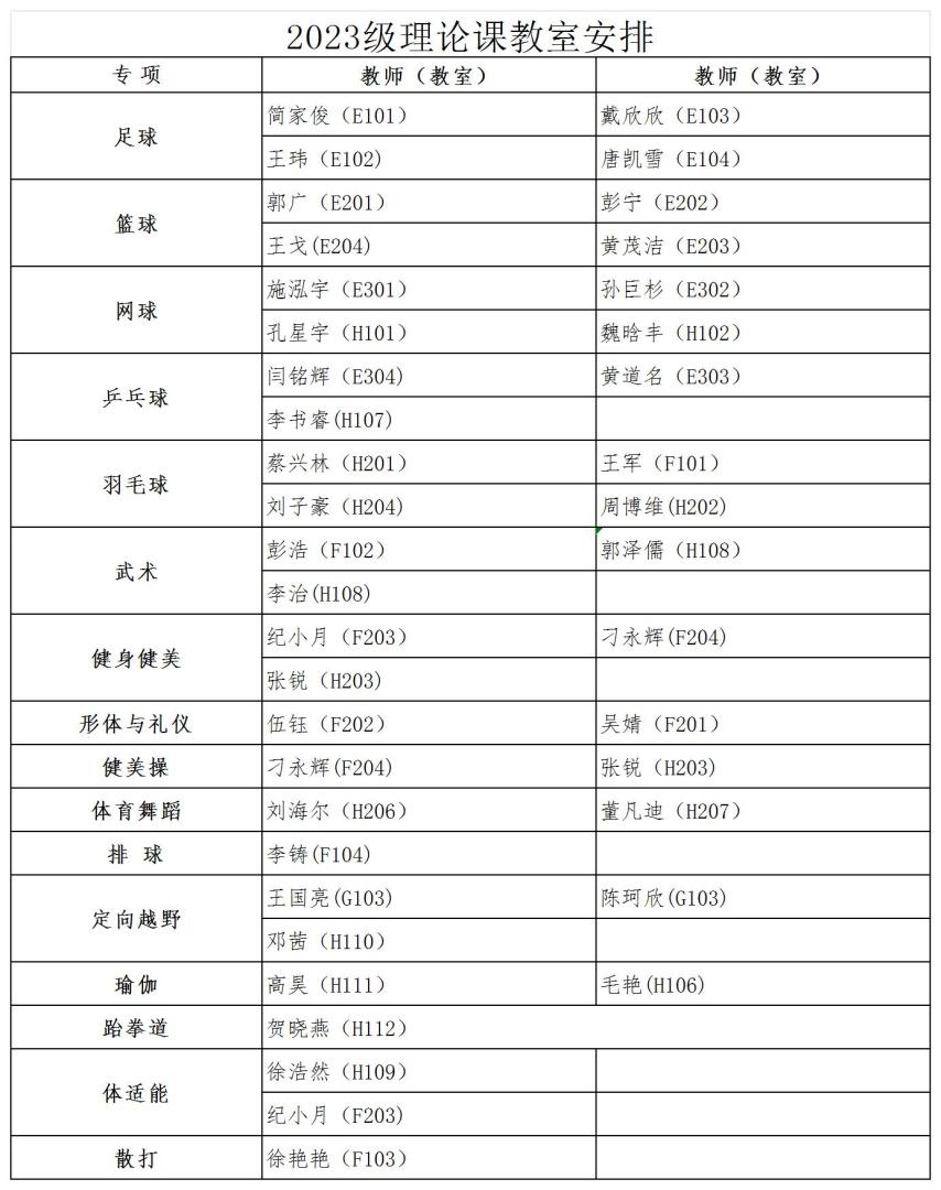 经教务处同意,本学期2023级本科生第3周体育课为爱体育(中国)体育官方网站理论课,10月7日起恢复户外教学。根据教室资源状况,现将理论课具体安排通知如下:
