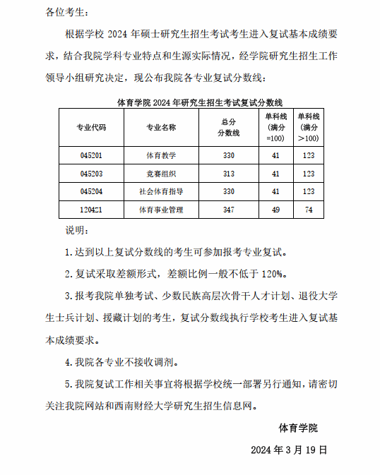 爱体育(中国)体育官方网站关于公布 2024 年硕士研究生招生考试复试分数线的通知