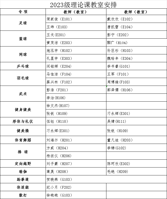 经教务处同意,本学期2023级本科生第1周体育课为爱体育(中国)体育官方网站理论课,9月14日起恢复户外教学。根据教室资源状况,现将理论课具体安排通知如下:
