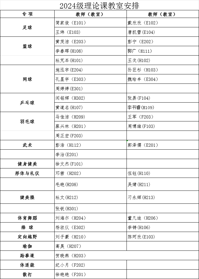 经教务处同意,本学期2024级本科生第1周体育课为爱体育(中国)体育官方网站理论课,9月15日起恢复户外教学。根据教室资源状况,现将理论课具体安排通知如下: